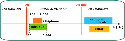 - les ultrasons ont des fréquences supérieures à 20 000 Hz. Ils sont audibles par les chauves-souris, les chats, les dauphins.