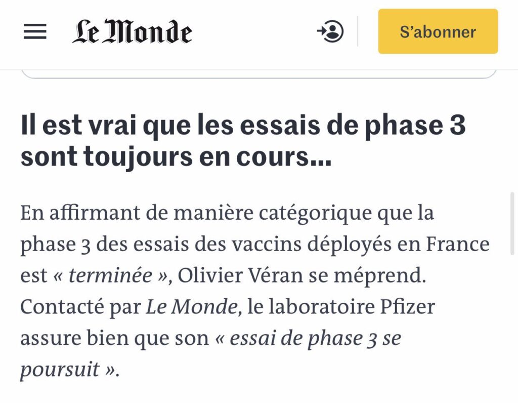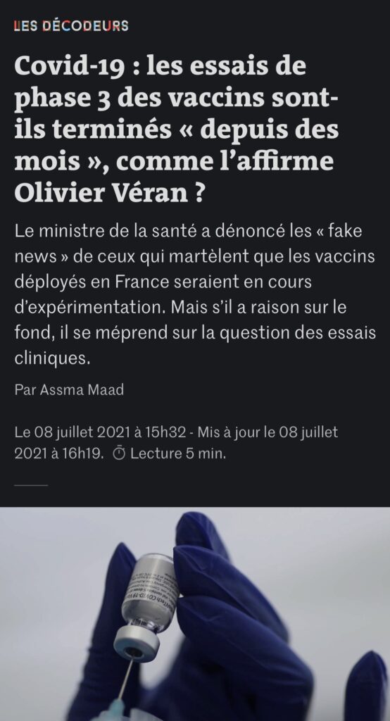 « Parmi les “fake news” que l’on entend, il y aurait celle qui consiste à dire que le vaccin serait encore en cours d’expérimentation. C’est absolument faux. La phase 3 est terminée depuis des mois, elle est validée. » O.Veran, Juillet 2021