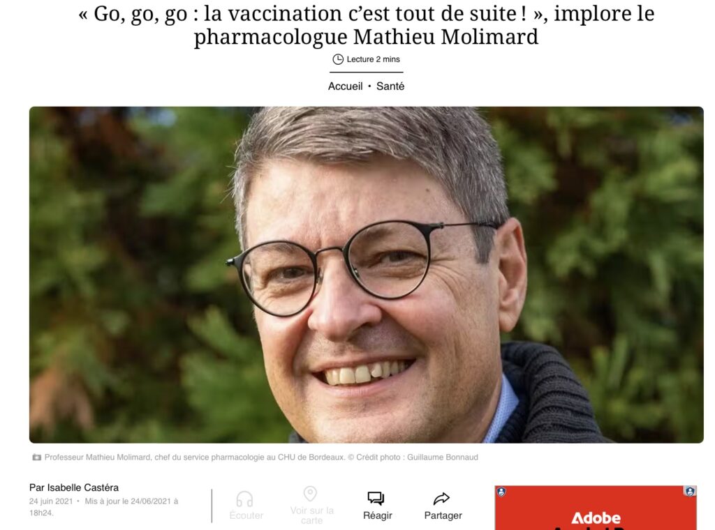 Parmi les médecins médiatisés durant la crise COVID, le Professeur MOLIMARD n’a pas caché son enthousiasme pour les injections à ARNm. Pour lui, elles étaient le moyen d’enrayer définitivement la pandémie. Le regretté généticien, Axel Kahn, partageait cette croyance lorsqu’il témoignait sa conviction de pouvoir à nouveau serrer et embrasser ses petits enfants, dès sa vaccination anti-COVID pratiquée. Mathieu MOLIMARD a lui aussi prêché la bonne parole, sans jamais faiblir.