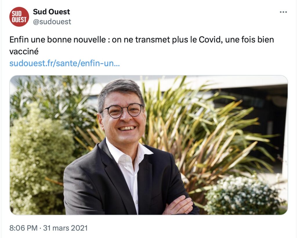 Contrairement à Olivier VERAN (neurologue), Mathieu MOLIMARD (pneumologue) s’exprime ici en tant que médecin, professeur de pharmacologie, et défenseur de la rigueur scientifique. C’est à ce titre qu’il a déclaré en 2021 au journal Sud-Ouest : « Enfin une bonne nouvelle ! On ne transmet plus le COVID une fois vacciné. » (M.Molimard, 21/03/2021)